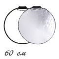 Отражатель 2 рабочие поверхности, одна – серебристая, другая — белая. Диаметр — 60 см. Ручка позволяет удобнее держать отражатель, может пригодиться, если вы работаете без ассистента.