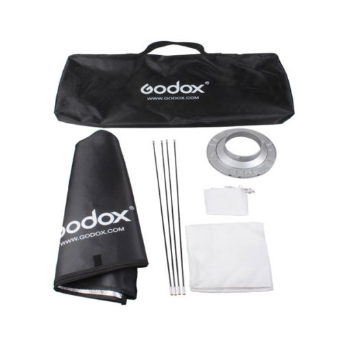Софтбокс Godox 60×90 сантиметров изнутри покрыт серебряной тканью, а также имеет два рассеивателя за счет чего свет получается мягким даже несмотря на небольшие размеры софтбокса. В отличие от стандартных зонтичных софтбоксов, Godox 60×90 имеет съемные спицы, благодаря чему вся конструкция умещается в небольшую сумку, а также алюминиевый адаптер для байонета Bowens, что позволяет использовать его с большим диапазоном студийного освещения.