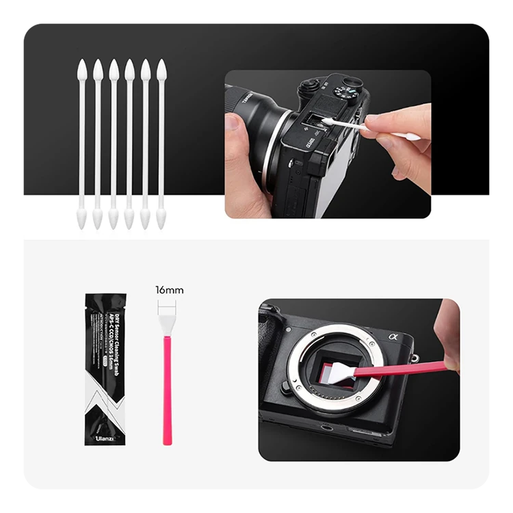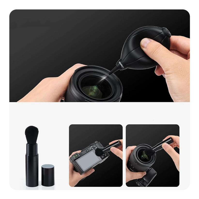 Специальная щеточка удалит пыль, плесень и частицы с кроп-матрицы. Микрофибровая салфетка с защитным спреем бережно очищают линзы без разводов. Силиконовая груша с гибким носиком и кисть эффективно устраняют загрязнения из труднодоступных зон. Двусторонние палочки очищают разъемы, а безворсовые салфетки обрабатывают корпус гаджет