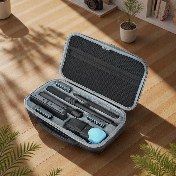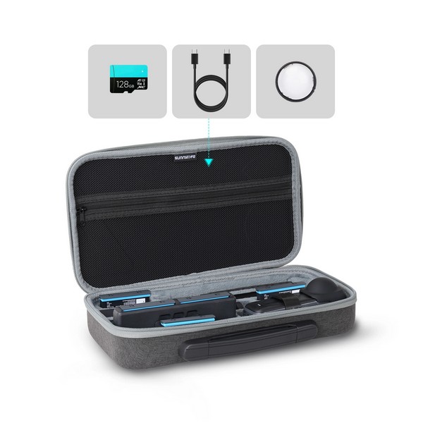 — В сумку-органайзер можно поместить Insta360 X5 + защитную крышку объектива или Insta360 X5 + рамку + защитную крышку объектива, невидимую селфи-палку длиной 85 см, штатив для режима Bullet Time, селфи-палку Bullet Time 2.0 или селфи-палку Bullet Time, зарядное устройство, 6 аккумуляторов (один в камере и два в зарядном устройстве) и другие аксессуары для камеры.