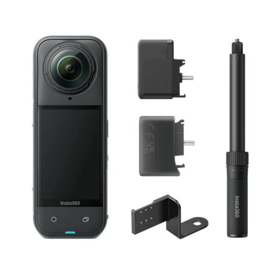 В комплект Creator Bundle входит 1 камера Insta360 X5, 1 селфи-палка Bullet Time 2.0, 1 адаптер для микрофона, 1 невидимый микрофонный «холодный башмак» (для микрофона RØDE) и 1 устройство Quick Reader.