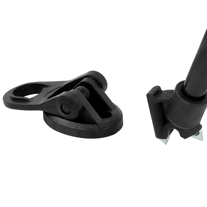 Алюминиевый трипод штатива представляет собой 3-секционную рамочную конструкцию с ногами из легких трубок Ø20 и 14 мм. Секции опор независимо выдвигаются и фиксируются клипсовыми зажимами, что дает возможность устанавливать штатив на неровной поверхности. Нижние секции опор оканчиваются шипами, на которые надеваются резиновые опоры для контакта с поверхностью. Опоры-башмаки обеспечивают устойчивое сцепление с гладким полом, а шипы – с грунтом. Высота штатива регулируется от 90 до 184 см, в сложенном виде длина штатива – 91 см.