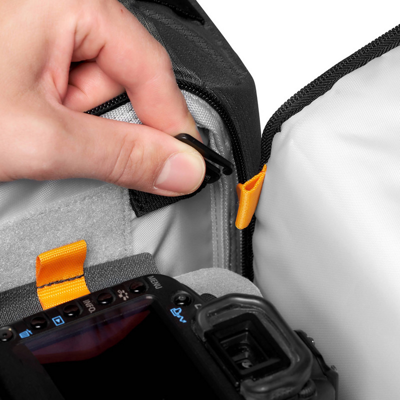 Система QuickDoor™: Двухступенчатая конструкция бокового доступа позволяет молниеносно извлечь камеру через боковую панель. Специальные страховочные клипсы предотвращают случайное раскрытие молнии и выпадение содержимого при активном движении .