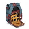 Прочная водоотталкивающая ткань идеально сочетается со вставками из натуральной кожи и фирменной винтажной фурнитурой. Внутренняя часть снабжена яркой эвкалиптовой печатью, напоминающей ландшафты Австралии. Внутренние разделители снабжены системой защиты Manfrotto. В рюкзаке предусмотрен доступ к оборудованию со стороны спины. Расположение: DSLR камера с установленным объективом 70-200/2.8, до пяти дополнительных объективов и аксессуаров. Дополнительный боковой доступ позволяет быстро достать камеру. Защитные вставки съемные, удалив их, рюкзак можно использовать как повседневный. Боковое крепление штатива, внутренние и внешние карманы, отделение для ноутбука до 15 дюймов. Мягкая, дышащая ткань на спине и лямках. Ремень для установки на тележку или чемодан на колесах. Ремни для фиксации рюкзака на груди.