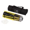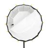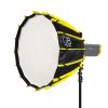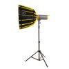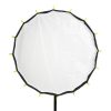 16 прочных термостойких спиц и конструкция тента с липучками обеспечивают полное симметричное натяжение тента-рефлектора. На литом металлическом кольцо-адаптере расположены байонетное кольцо Bowens (сменное), 16 пазов-держателей со спицами и специальные металлические кнопки, фиксирующие спицы в этих пазах. Софтбокс раскладывается за минуту простым заведением спицы в паз. Чтобы сложить софтбокс, необходимо нажать 16 подпружиненных кнопок, фиксирующих спицы, что тоже не займет много времени. Прочная надежная конструкция выдержит частое использование в течение многих лет.
