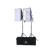 Суммарная мощность приборов 100 Вт. Цветовая температура 5500 К. Для получения направленного и мягкого света рекомендуется использовать комплектные софтбоксы 50х70 см. Для получения более жесткого света, с софтбоксов можно снять диффузор. В комплекте две легкие и удобные стойки, максимальная высота которых 210 см. Для удобства транспортировки и хранения предлагается прочная сумка с двумя ручками.