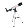 Что можно в него увидеть? В него можно увидеть лунные кратеры диаметром больше 10 км, Марс, Сатурн и фазы Венеры. С помощью сменных окуляров (в комплекте 2 шт.), можно получить увеличение от 18х до 90х. Окулярная часть с 90° зеркалом позволяет удобно вести наблюдение, разместив прибор просто на столе (высота штатива 360 мм). Наблюдения днем лучше вести при увеличении 18х (с окуляром 20 мм), тогда ближняя точка фокусировки будет около 5 метров.