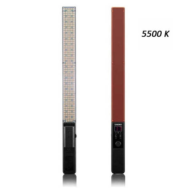 Вытянутый осветитель Yongnuo YN360 имеет 40 RGB диодов, а также 160 диодов температурой 3200K и 160 температурой 5500K. Яркость диодов плавно регулируется при помощи диммера на ручке устройства. Также снизу ручки имеется стандартное резьбовое отверстие 1/4″. Помимо прочего настройками осветителя можно управлять дистанционно через приложение на смартфоне.